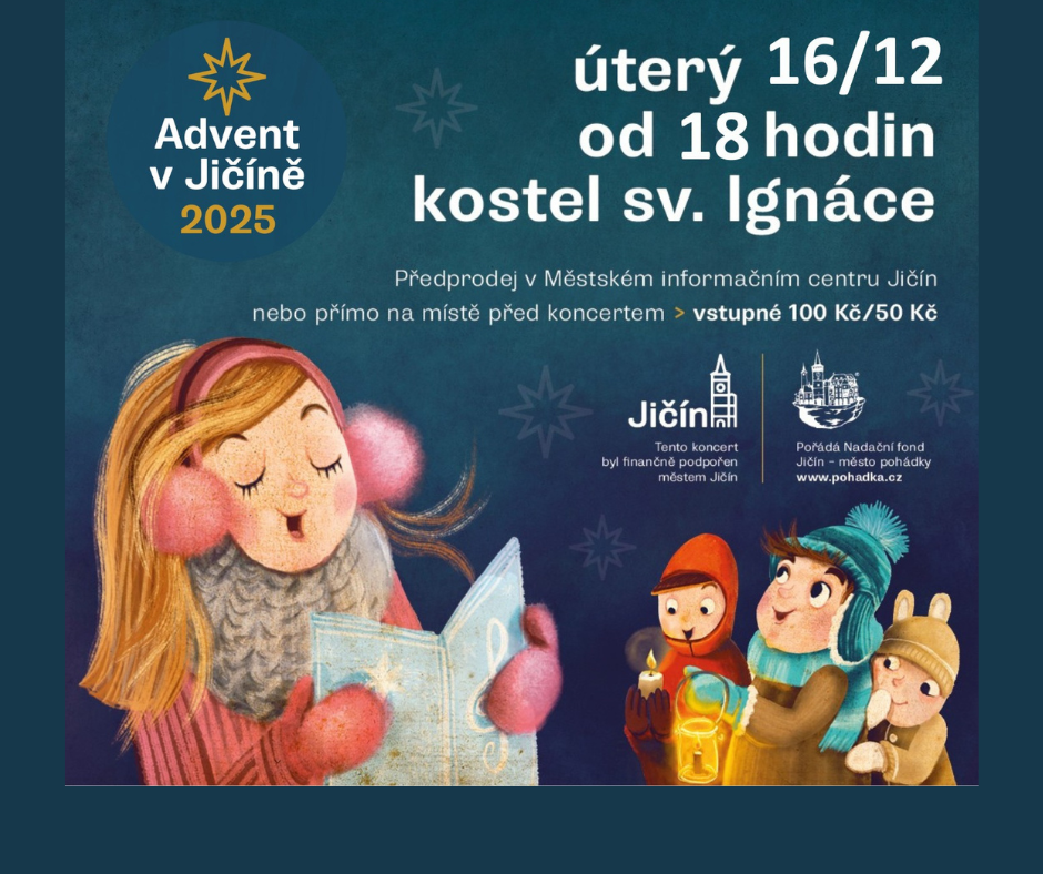 Přijďte si užít tradiční pohádkový adventní koncert Kůsovic koledníků, který proběhne v úterý 16.12.2025 od 18:00 v kostele sv. Ignáce v Jičíně. Vstupenky v předprodeji v Městském informačním centru od 8.12.2025 Prodej vstupenek v místě konání hodinu před koncertem. Cena 100 Kč plné vstupné / 50 Kč snížené (děti a studenti do 26 let a […]